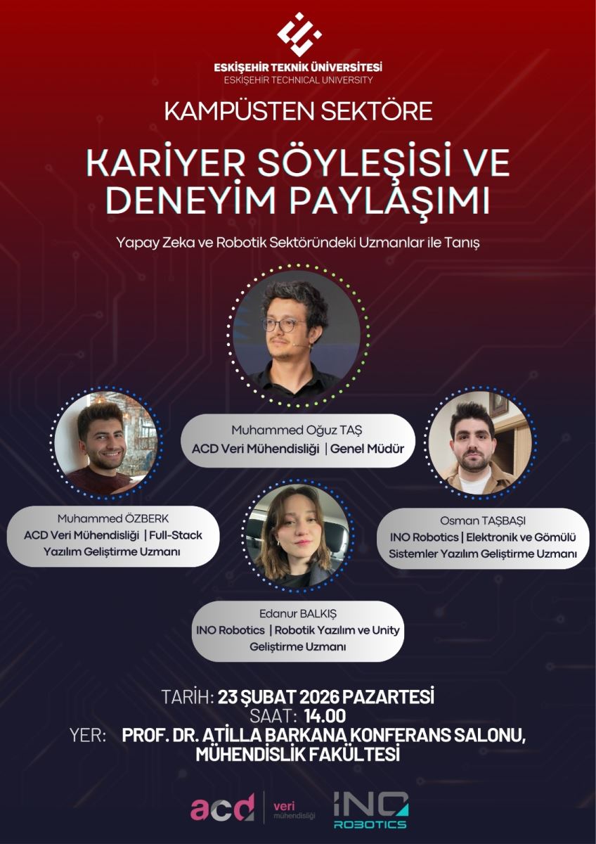 Eskişehir Teknik Üniversitesi Bilişim Teknolojileri Meslek Yüksekokulu bünyesinde düzenlenen “Kampüsten Sektöre: Kariyer Söyleşisi ve Deneyim Paylaşımı” etkinliği, öğrencilerimizin yoğun katılımıyla verimli bir şekilde gerçekleştirildi. Yapay zekâ, veri mühendisliği, robotik ve gömülü sistemler alanlarında sektör deneyimine sahip uzmanların konuk olduğu program, öğrenciler ile sektör profesyonellerini bir araya getirdi.